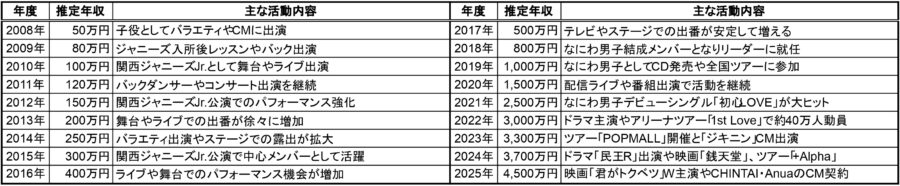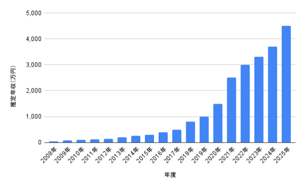以下では、活動内容と公開されている情報、そして業界の水準をもとにした各年の目安を一覧にしています。