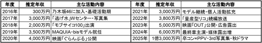 結論の方向性を先に言うと、昨年は地上波ドラマの最終章で堅調、今年は卒業コンサート×生配信と3rd写真集のヒットが重なり、キャリア最高水準に達したと考えられます。