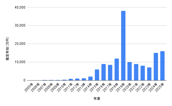 年ごとの推定年収表とグラフも併載し、2005年から現在までの推移がひと目でわかる構成にしました。