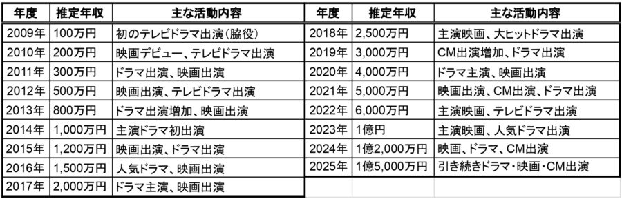 秋の連ドラW主演で露出を維持しつつ、映画級の超大型ヒットは昨年ほど見込みにくいことから、約1億円であると考えられます。